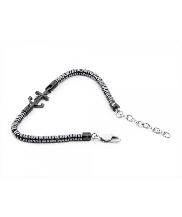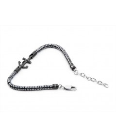 Bracciale uomo acciaio nichelato nero con soggetto con ancora con chiusura moschettone e catenina per regolare la misura.