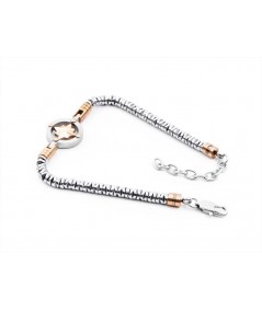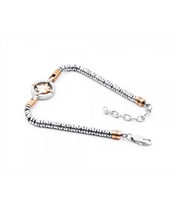 Bracciale uomo acciaio tubulare bicolore bianco-ramato con soggetto rosa dei venti con chiusura moschettone e catenina per regolare la misura.