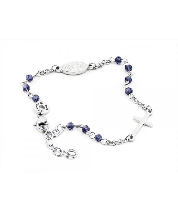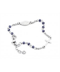 Bracciale Rosario con palline Blu, crocetta e medaglia con chiusura moshettone e catenina all''estremità per regolare la misura