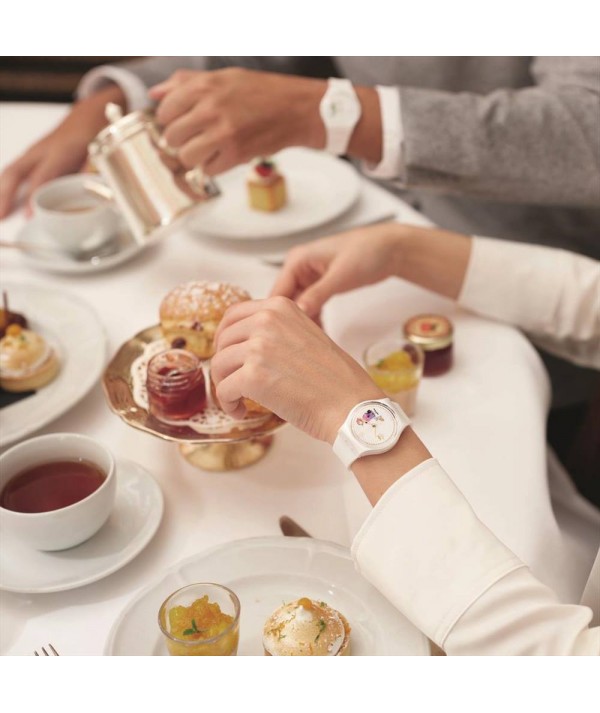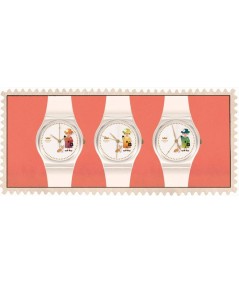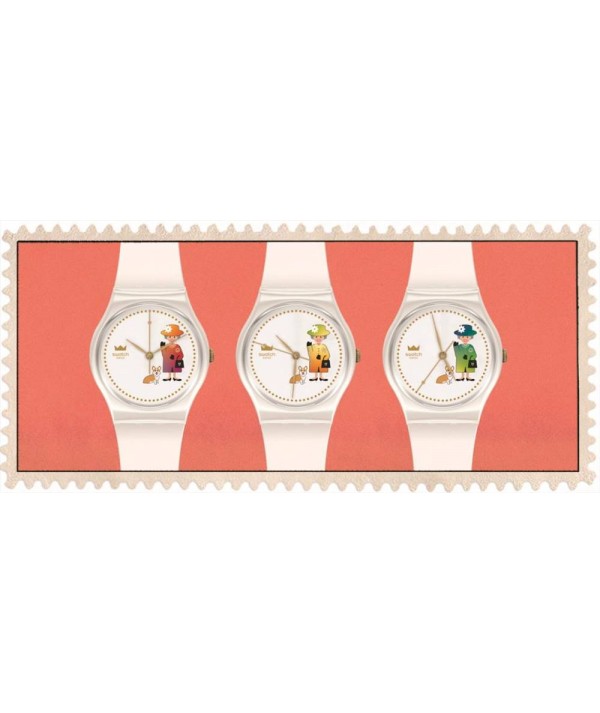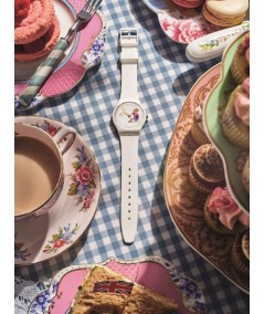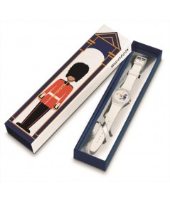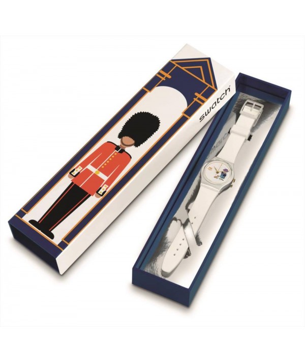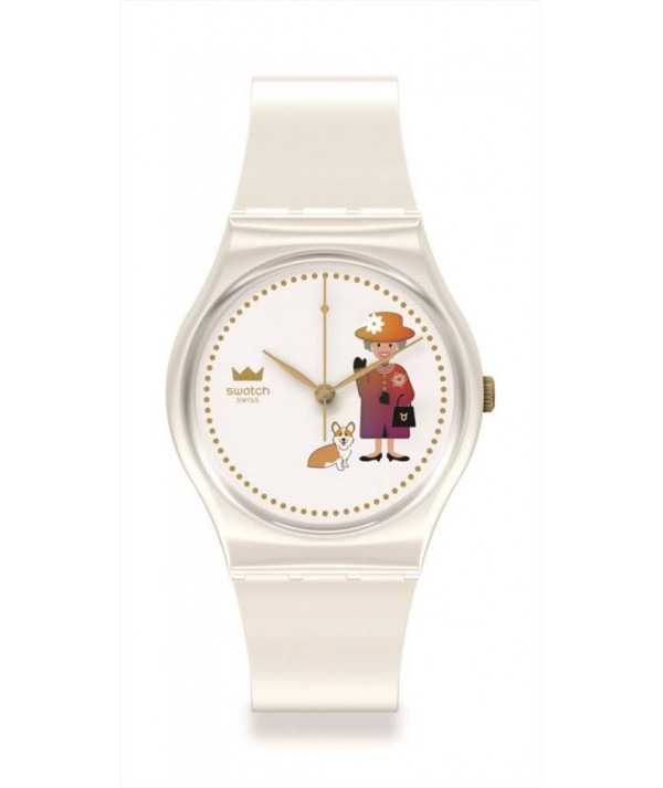 Orologio con movimento al quarzo, impermeabile a 3 atm, cinturino in silicone, fibbia e cassa in plastica. Realizzato in onore della regina, questo orologio presenta sul quadrante 70 punti colorati in oro per festeggiare i suoi anni di regno. La particolarità risiede nel datario che cambia colore per modificare ogni giorno il colore dell'outfit della regina.