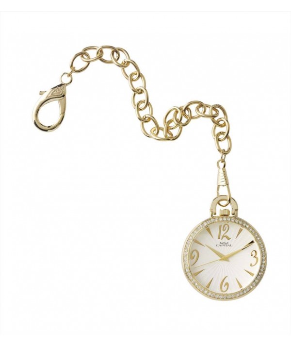 Orologio donna Tasca in acciaio laminato Oro e pietre con catena con moschettone grande da agganciare alla borsa, movimento al Quarzo.